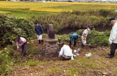大崎支部(支部長・齋藤守治)は、9月13日、大崎市田尻地区にある故上田雄二2空曹の慰霊碑の清掃と周辺の草刈り等を支部長以下9名の会員で行った。作業は早朝6時から開始し堤防の法面から慰霊碑まで草刈り機等で除草した後、持参した真水で慰霊碑を磨き約1時間で完了した。清掃後生花を供え全員で合掌・焼香して慰霊した。